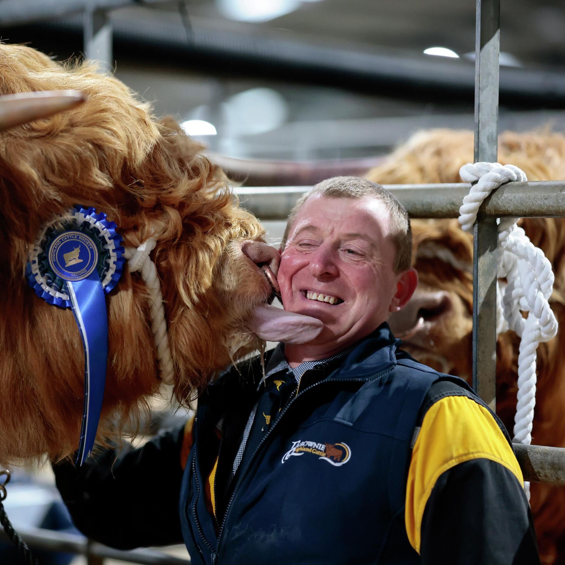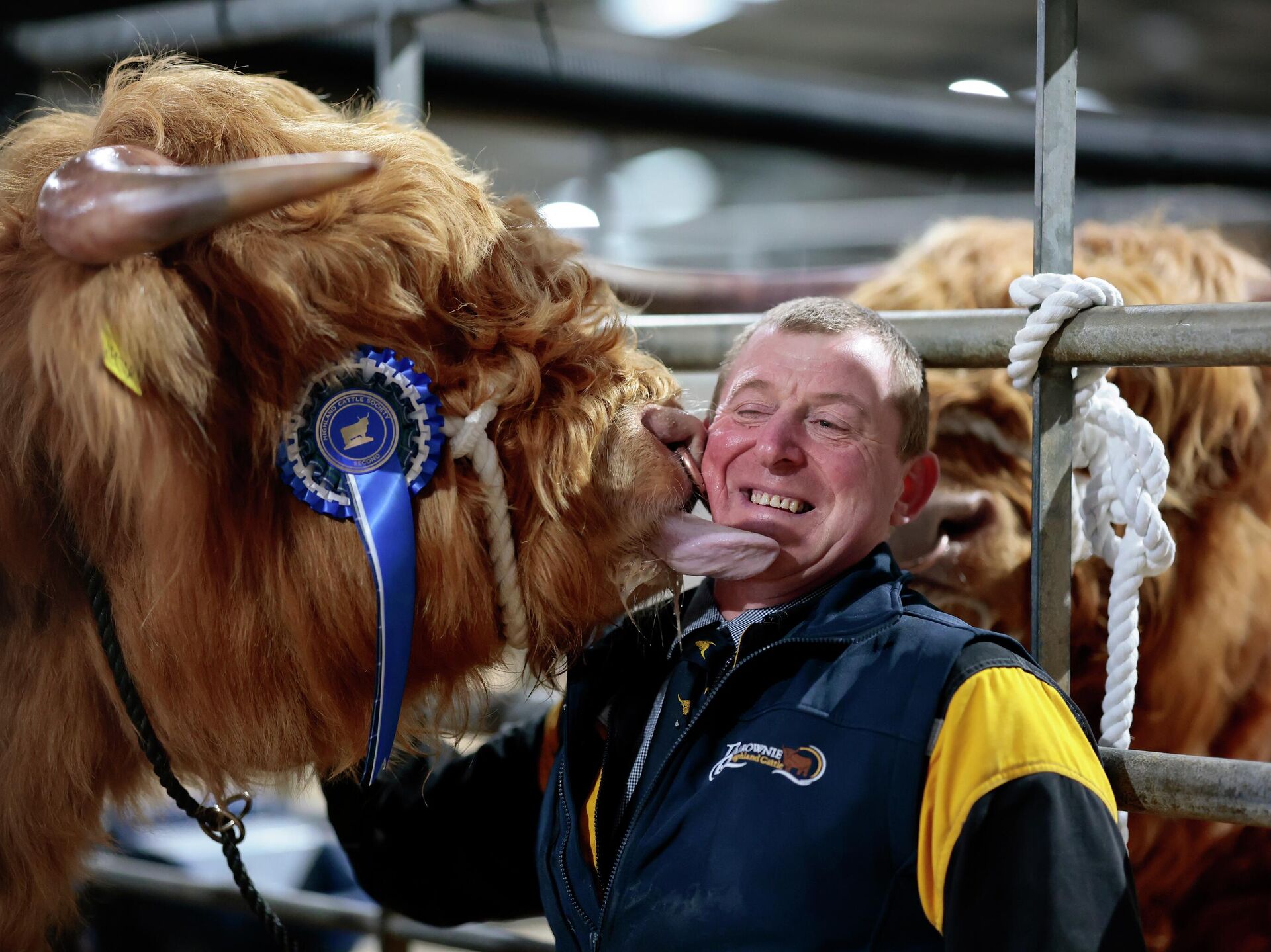 ფერმა Balrownie Farms-ის წარმომადგენელი მაიკ ტეილორი გაზაფხულის ყოველწლიური 135-ე გამოფენა-გაყიდვისთვის ჰაილენდის ჯიშის ძროხებს ამზადებს, შოტლანდია.