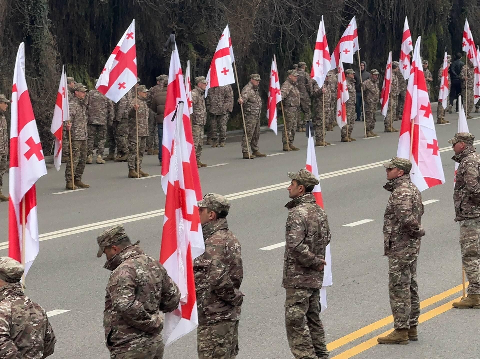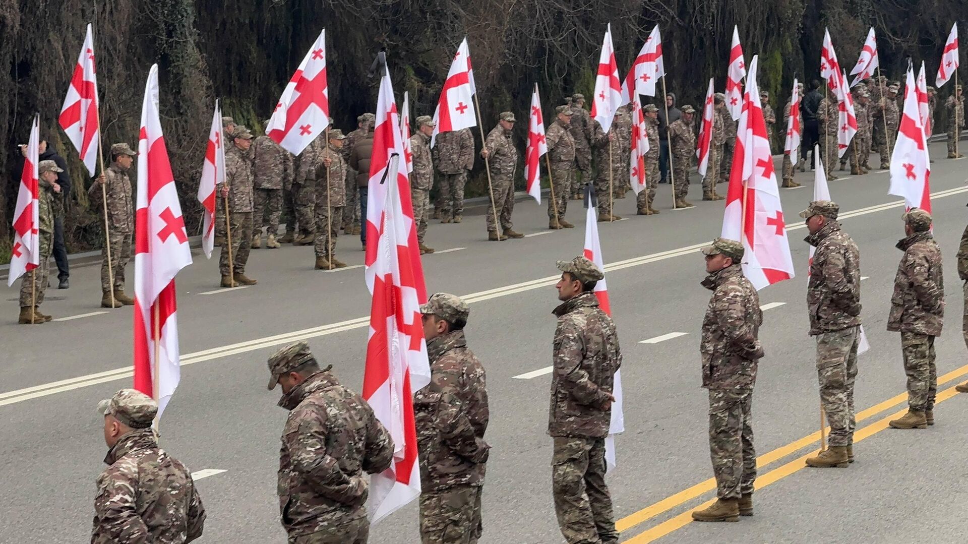 ჯარისკაცები მთელ პერიმეტრზე დროშებით ხელში არიან განლაგებული.